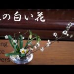こんにちは、ノバナです♪ お花の種類が増えて嬉しい季節\(^o^)/ お花の色合いも増えてきました(^^♪ そんな中、白いお花だけを集めてみました。 どの季節にも白いお花は咲きますが、 冬と春とを行ったり来たりなこの季節だと、 雪解けの清々しいイメージが浮かびます。 寒い時には、暖かさを加えたいところですが、 薄いガラスの器を、氷に見立ててみました。 梅の枝は直線的。 水仙の茎も直線。 直線は、なんだか冷たい印象になりますね。 クリスマスローズは曲線的だけど、もう少し曲線が欲しい。 シダでも加えようかな?とも思ったのですが、 水仙の葉で、曲線を描くことにしました♪ 大好きな?w輪ゴムを使えば簡単! 水仙の葉を全て同じ長さにしても良いし、 今回のようにランダムなのも楽しい♪ 水仙の葉っぱだけが残った時にも良いかも?( *´艸`)…